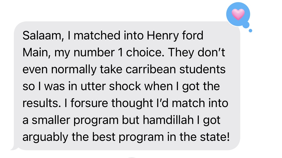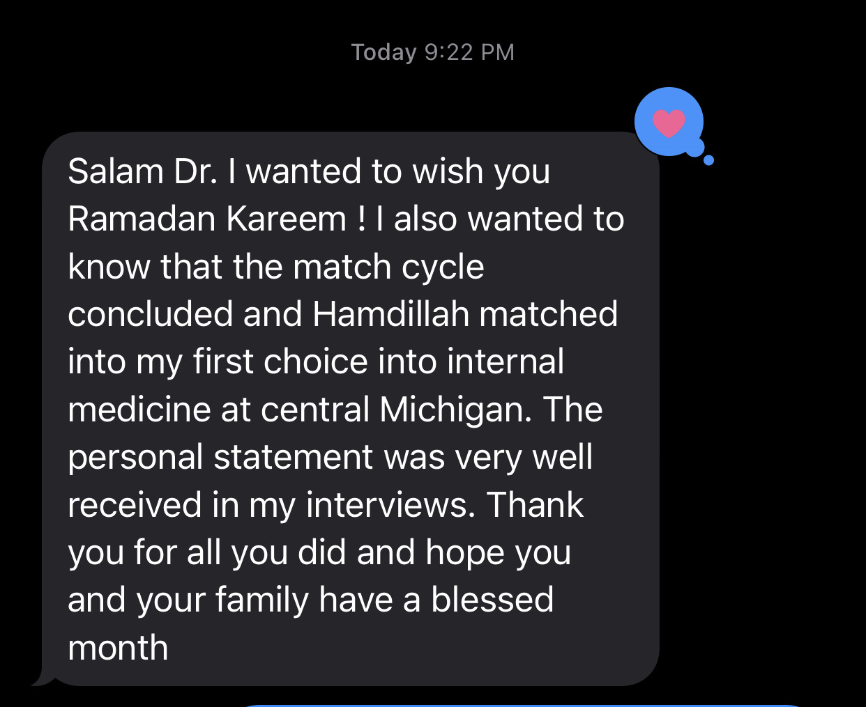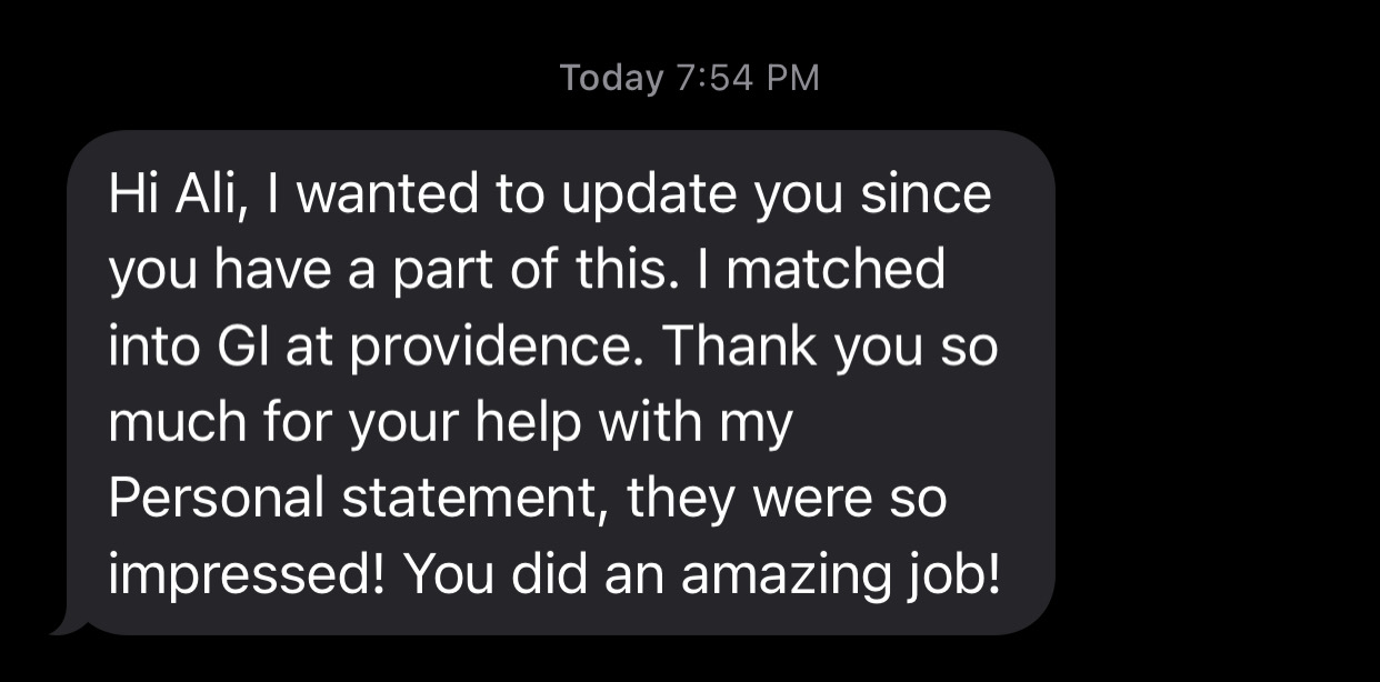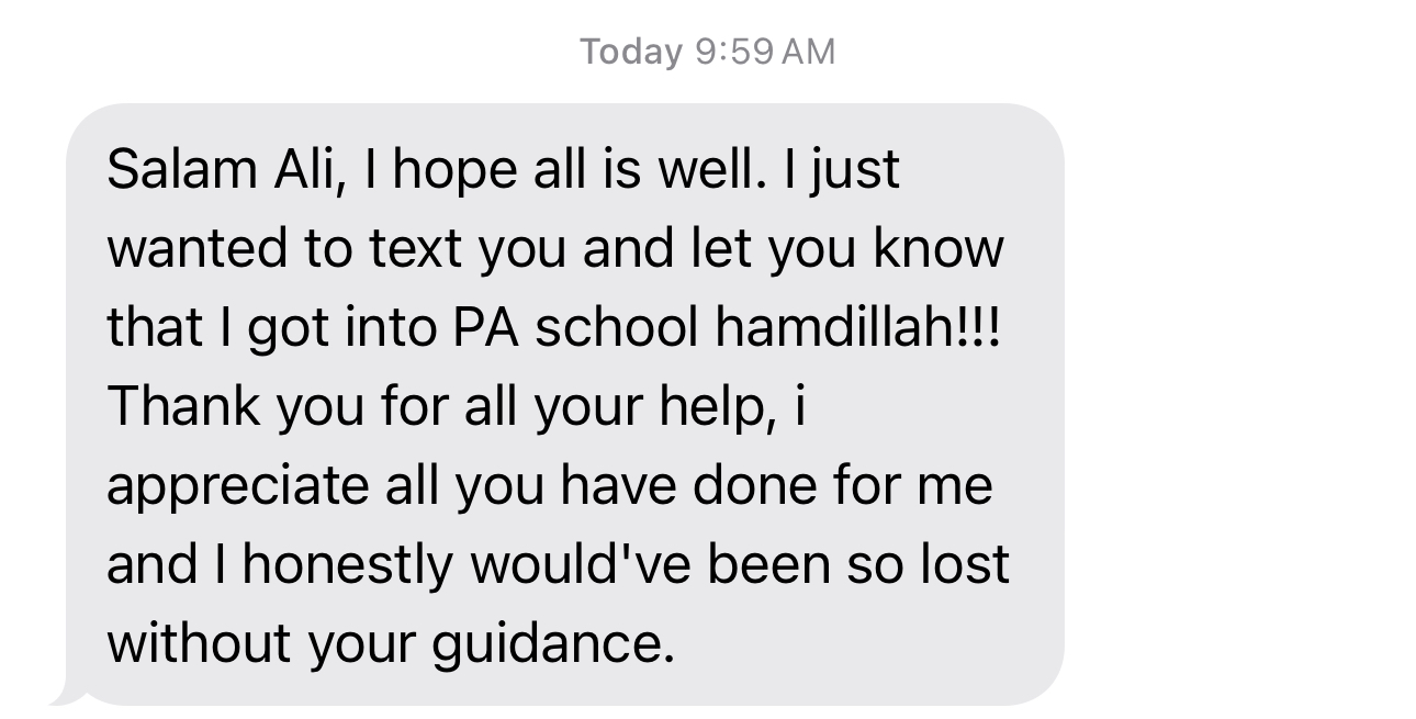 Dr. Ali helped me get into my UMich for college and medical school, and now match at my top-choice residency site!