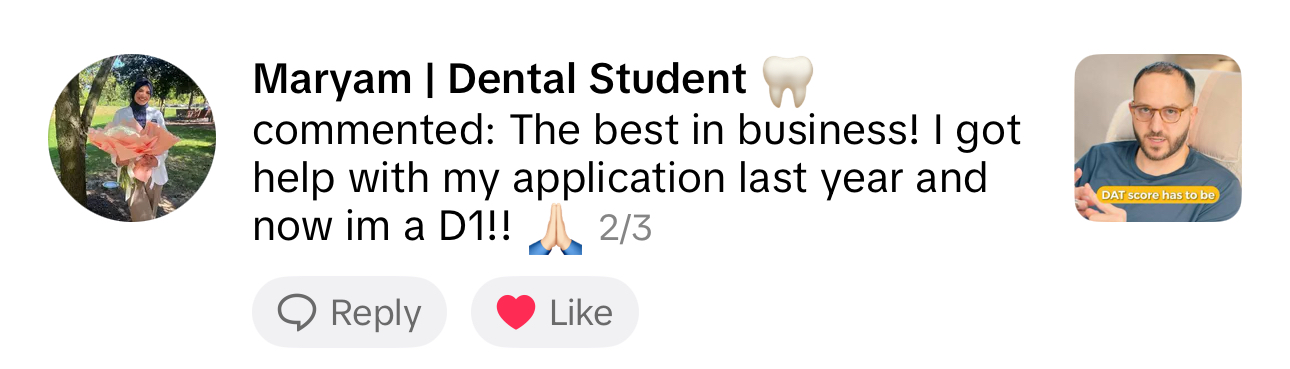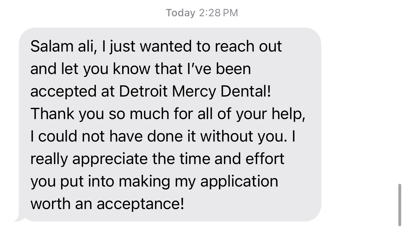 Thanks to Dr. Ali, I was accepted to NYU and UMN [for dental school], and waitlisted at three more top schools!