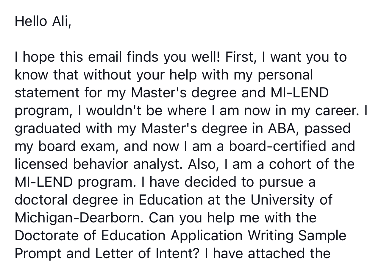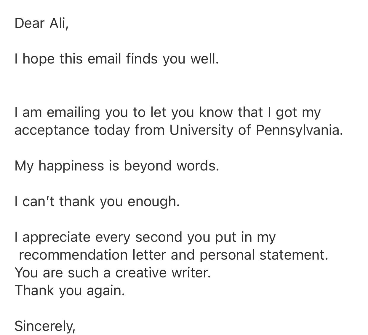 Your recommender asked you to write it yourself? You haven’t heard back from your dream school and need a letter of continued interest? You interviewed and want to send a letter of intent? Any type of letter you submit needs to be great, and Dr. Ali writes hundreds of captivating letters each year.