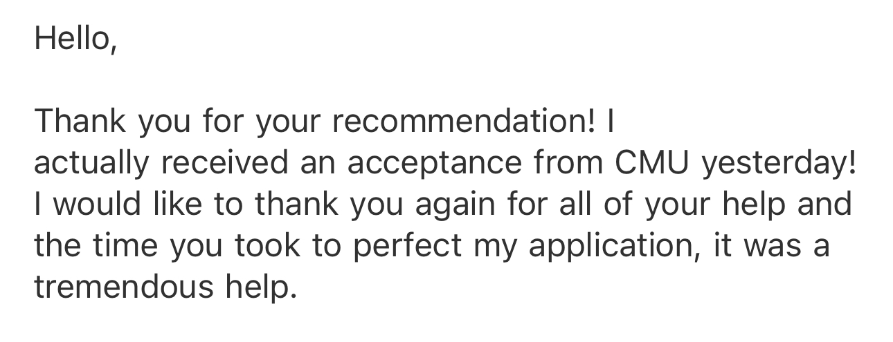 I got into LTU, MSU, and U-Toledo [for PA school]!!!!! I accepted the offer at MSU since you know it was my top choice. I can’t thank you enough for all your help and support.